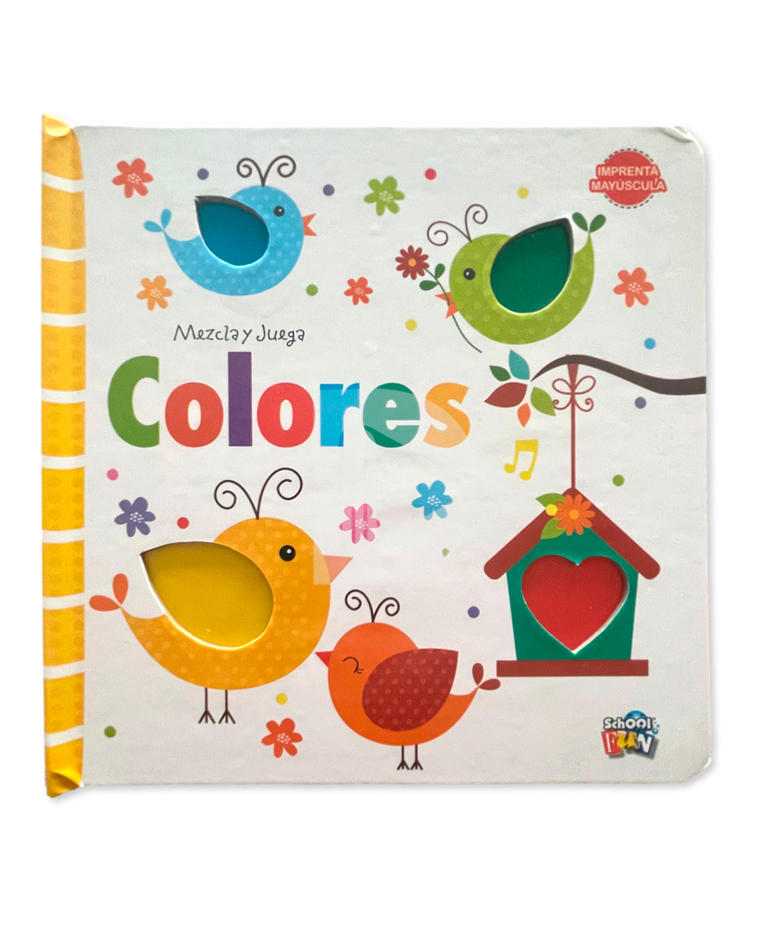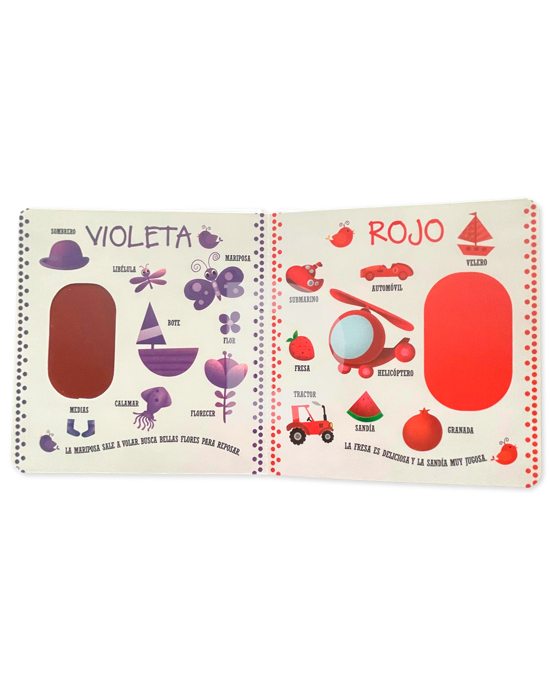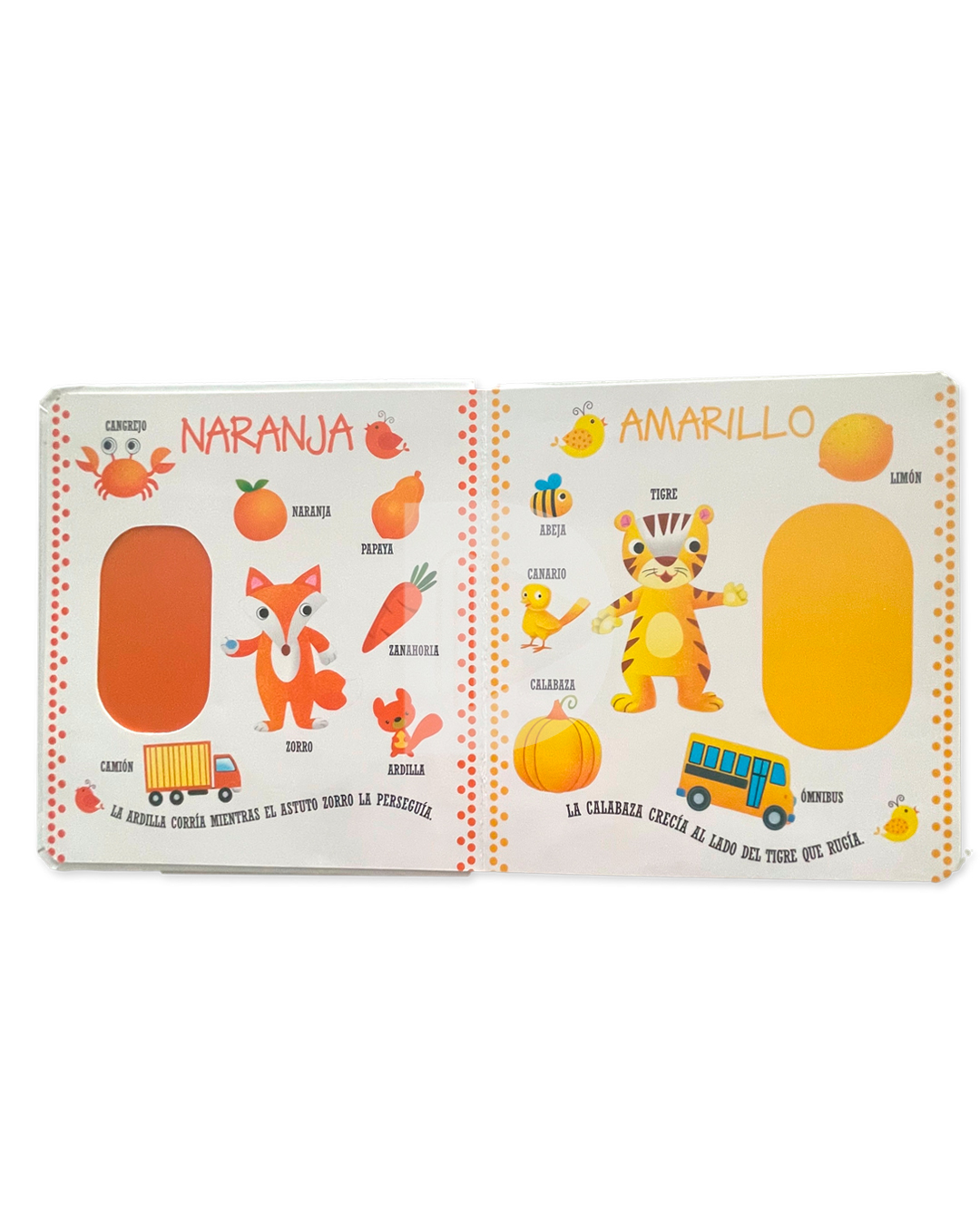 Esta colección está diseñada para que los más pequeños aprendan los colores y sus primeras palabras de manera divertida y sensorial. Cada página presenta un color con ilustraciones llamativas de objetos cotidianos —como frutas, animales y vehículos— y diferentes escenas que ayudan a asociar el color y las palabras con su entorno.