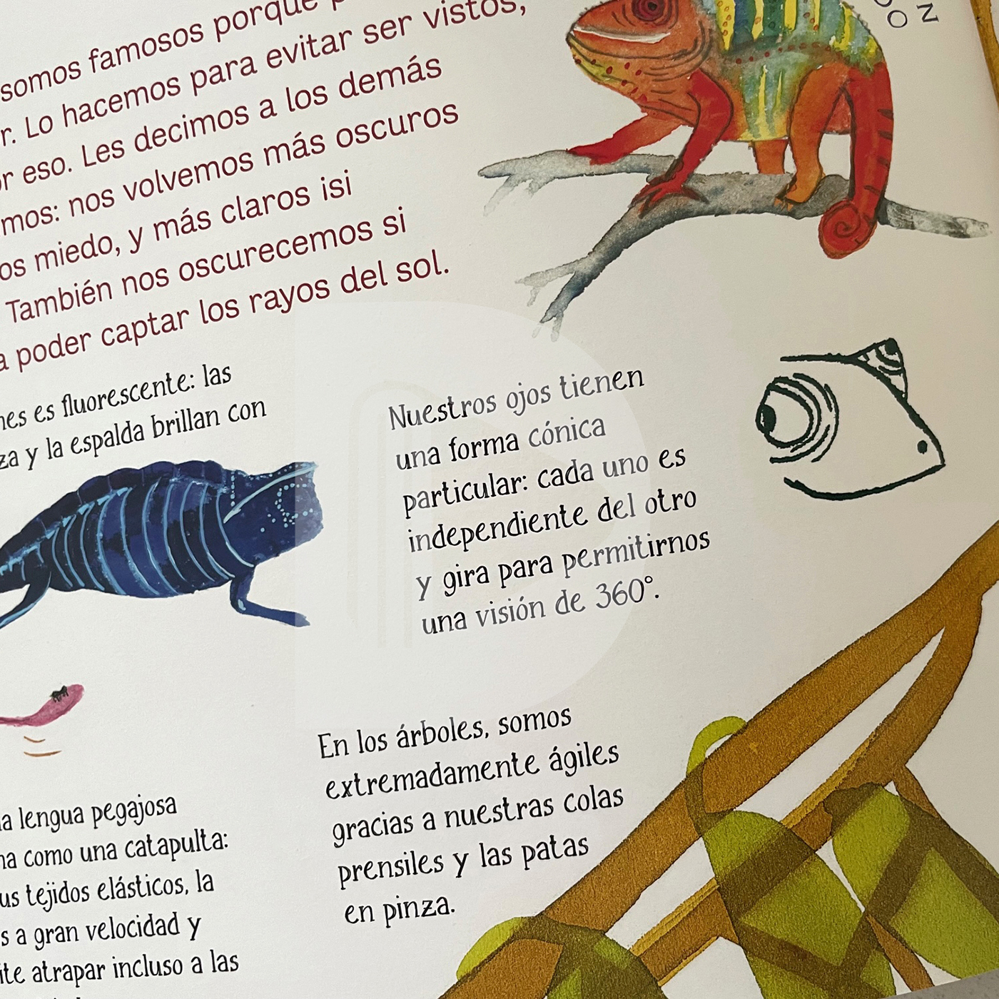 Sigue al camaleón a través de las coloridas páginas de este libro: ¡descubrirás los secretos de numerosas especies de reptiles, animales ancestrales que viven en el agua y en la tierra! Muchas curiosidades sobres escamas, armaduras, mudas, nidos, huevos, técnicas de caza, comunicación y cortejo.