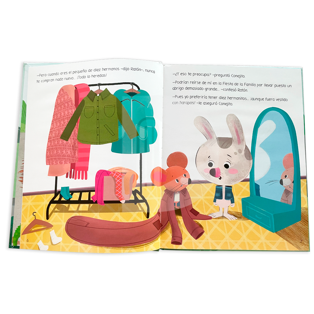 A este ratón no le gusta ser el más pequeño y cree que si fuese más grande todo sería mejor, y a este conejo no le parece justo que todos sus amigos tengan hermanitos para ir a la fiesta de la familia, mientras que él es hijo único… ¿Tendrán razón? ¿O quizá deberían aprender a ver las cosas de un modo más positivo? Por suerte para ellos, ni ser el más pequeño es un problema ni ser hijo único te convierte en un solitario.