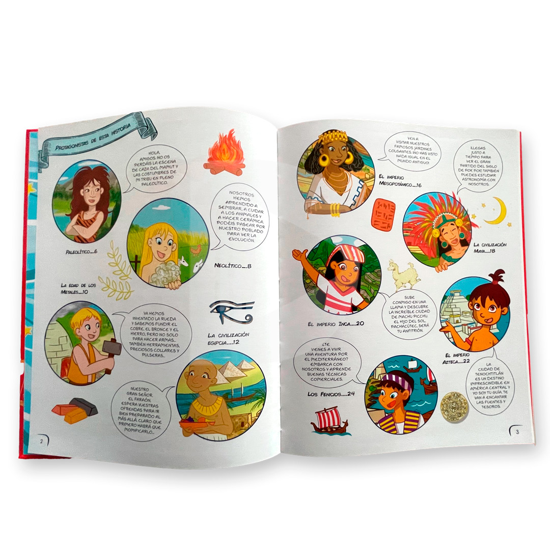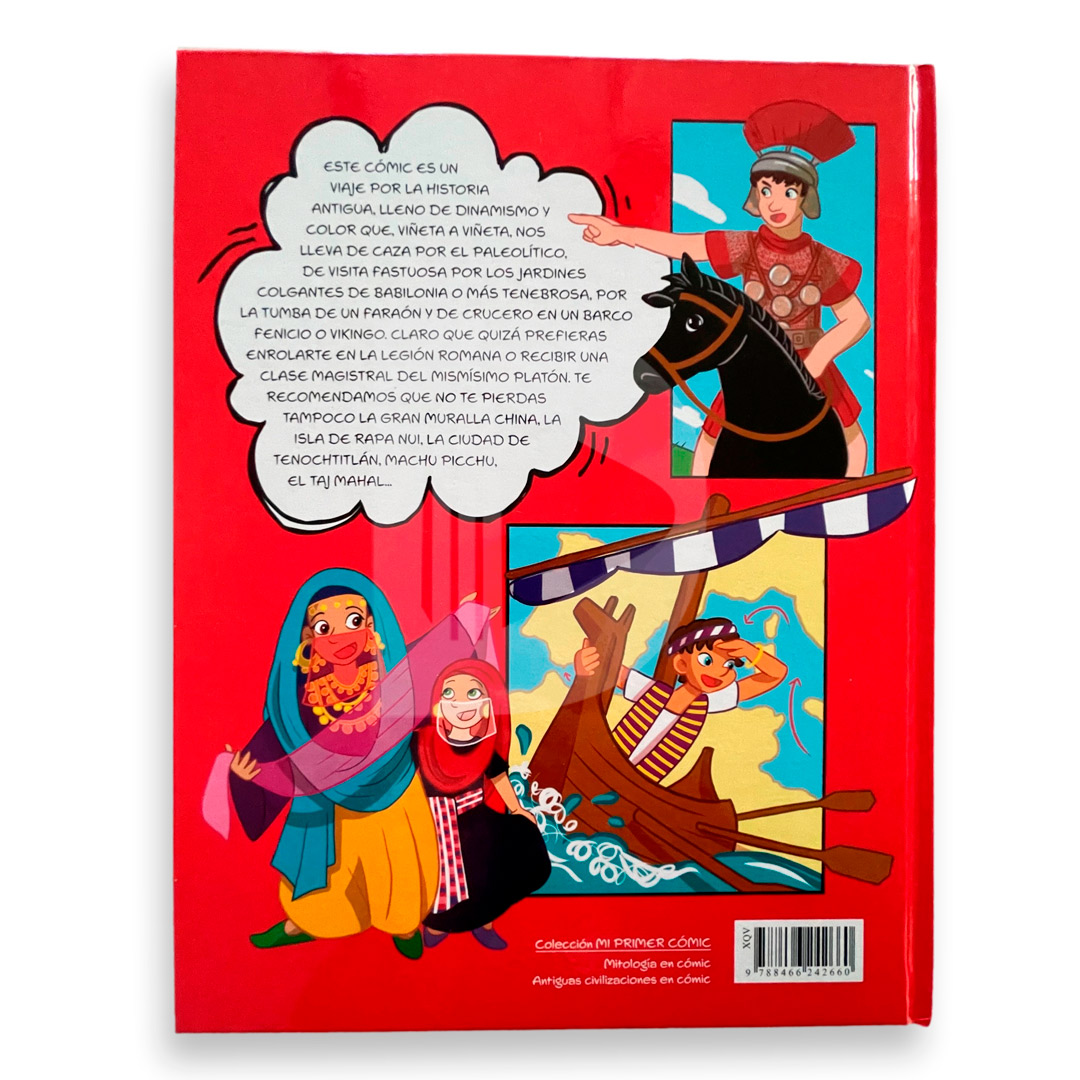 Este cómic es un viaje por la historia antigua, lleno de dinamismo y color que, viñeta a viñeta, nos lleva de caza por el pleolítico, de visita fastuosa por los jardines colgantes de Babilonia o más tenebrosa, por la tumba de un faraón y de crucero en un barco fenicio o vikingo.