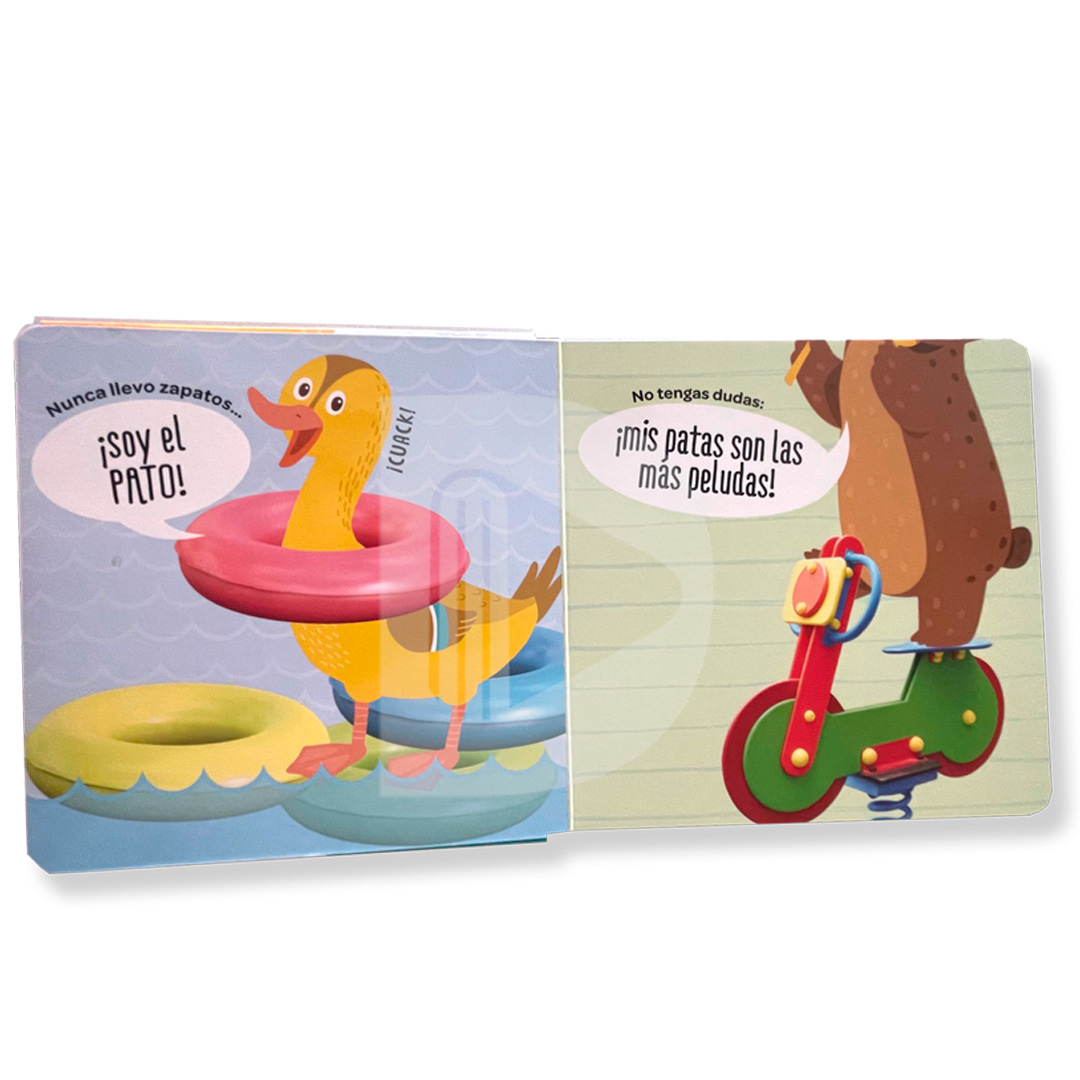 Presentamos cuatro libritos muy pequeños y blanditos. Zarpas, garras, o patas de pato, cascos o pezuñas, todos sin zapatos, con solo verles los pies ¿puedes saber quién es?