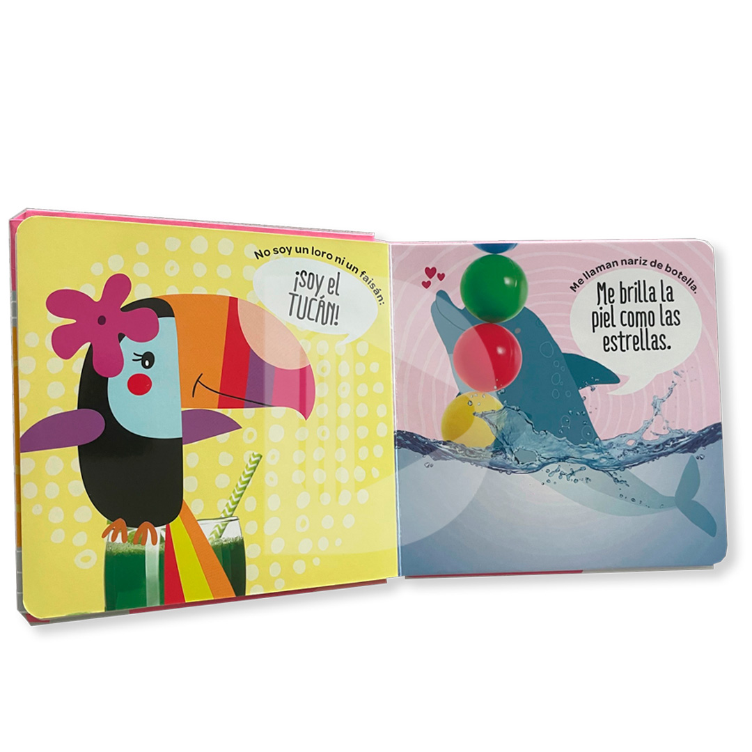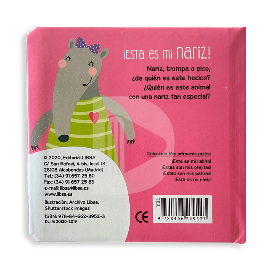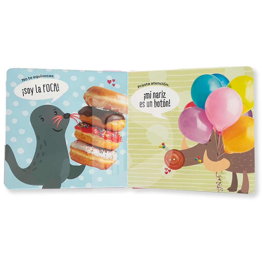 Presentamos cuatro libritos muy pequeños y blanditos. Nariz, trompa o pico, ¿de quién es este hocico? ¿Quién es este animal con una nariz tan especial?
