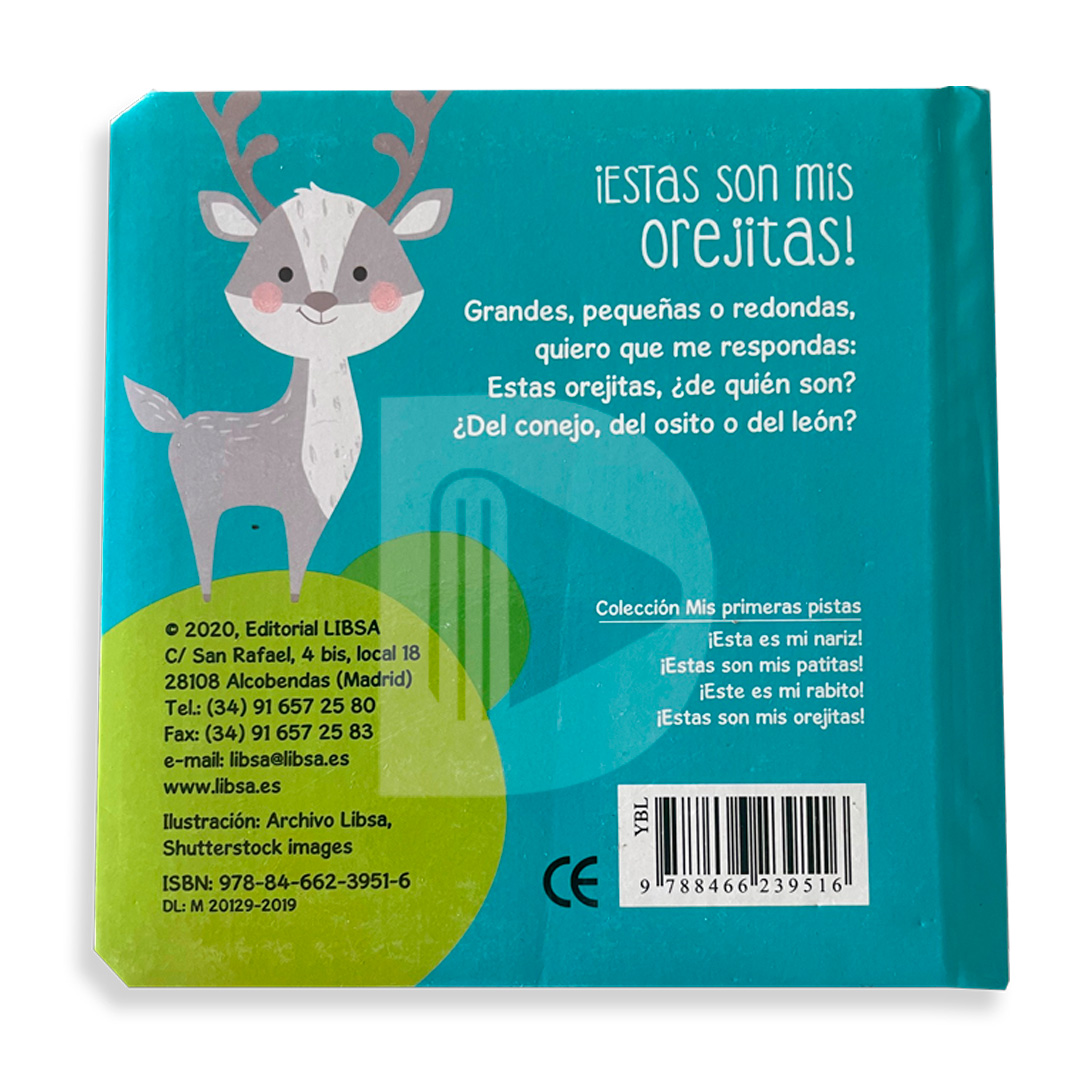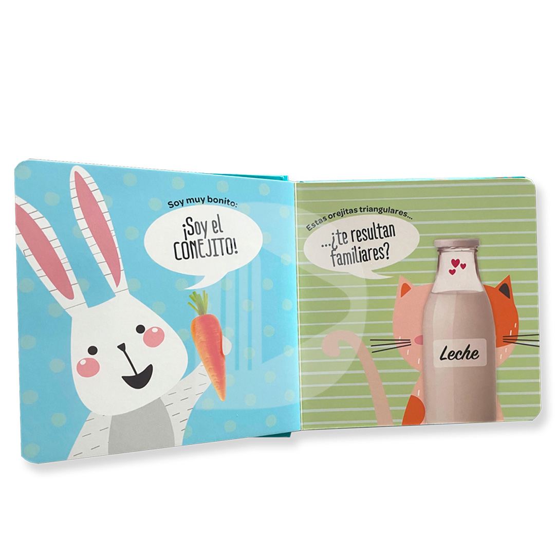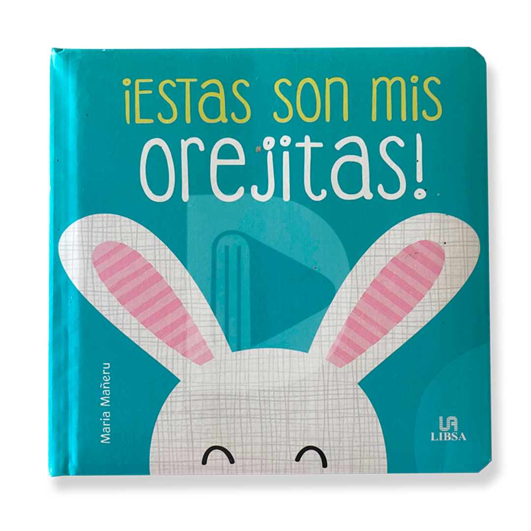 Presentamos cuatro libritos muy pequeños y blanditos. Grandes, pequeñas o redondas, quiero que me respondas, estas orejitas ¿de quién son? ¿Del conejo, del osito o del león?